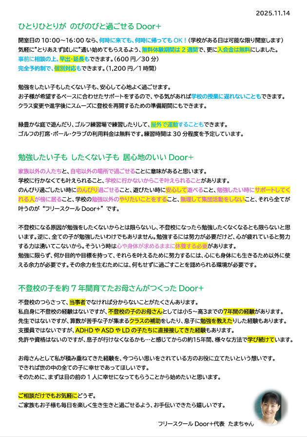 ↑ 代表の”たまちゃん”です(不登校の子・発達特性持ちの子の子育て経験がある2児の母です)